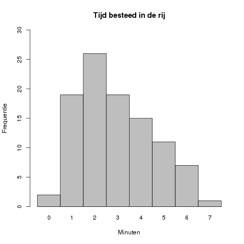 In dit geval ligt de piek van de grafiek bij #2# minuten, met een geobserveerde frequentie van #26#.